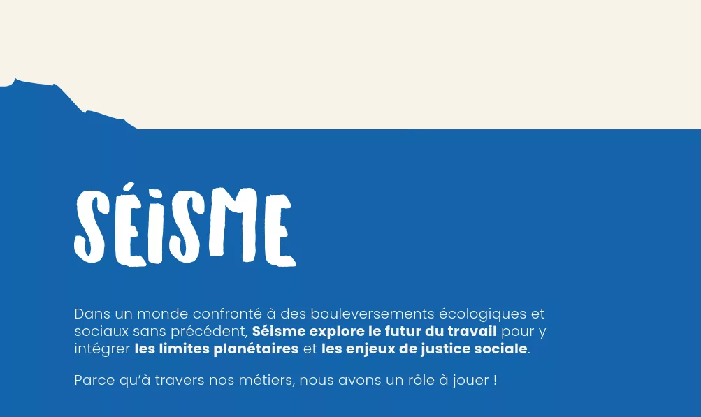 “Face aux constats écologiques et sociaux, chez Séisme, nous avons décidé d’agir pour bousculer les trajectoires professionnelles et placer les enjeux écologiques et sociaux au cœur de nos activités.” Séisme est une association qui, à travers 3 pôles (documentaire, événementiel et pédagogique), vient bousculer le monde du travail pour y intégrer les enjeux écologiques et sociaux. Son but est d’explorer le futur du travail pour encourager les gens qui le souhaitent à mettre leurs compétences, leur énergie et leur savoir-faire au service de la construction d’une société plus juste, plus inclusive et plus durable.